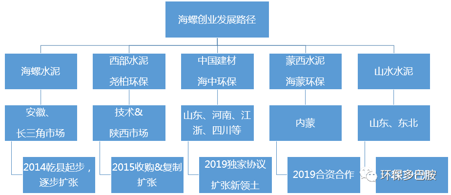 由于水泥行業(yè)市場格局較為固定,為了進(jìn)入海螺集團(tuán)影響力較小地區(qū)(海螺主要輻射安徽及長三角地區(qū)),則必須與其他水泥企業(yè)合作。2019年伴隨海創(chuàng)在水泥窯協(xié)同方面技術(shù)的成熟與管理的優(yōu)勢,公司有了將潛在對手變成合作伙伴的資本,從而開啟全國異地擴(kuò)張節(jié)奏!
