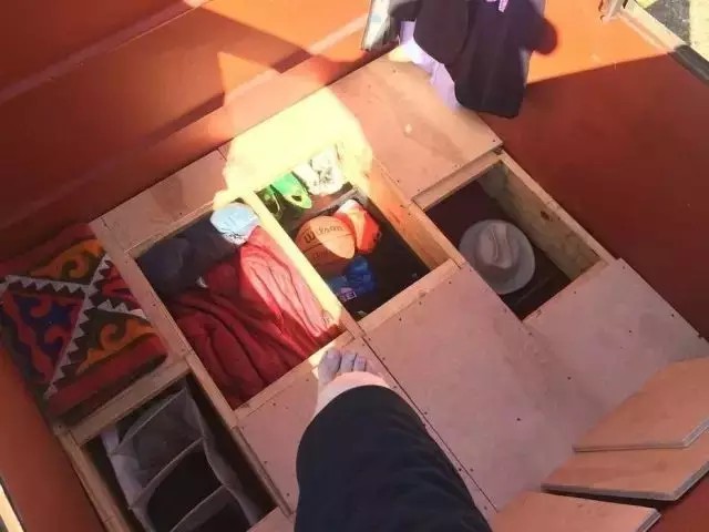 于是,為了將垃圾箱打造得更宜居,Jeff先在里邊鋪了一塊假地板,把地板下面放上許多個小格子,作為儲物的地方,