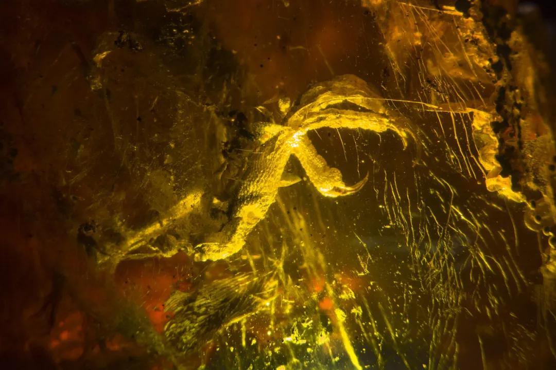 琥珀里的鳥(niǎo)化石,鳥(niǎo)足清晰可見(jiàn) | 琥珀是古代天然樹(shù)脂轉(zhuǎn)化形成的寶石。這塊琥珀標(biāo)本產(chǎn)自緬甸,形成于大約9900萬(wàn)年前的白堊紀(jì)中晚期,里面包裹著一只幾乎完整的雛鳥(niǎo),極為罕見(jiàn)。圖源@VCG