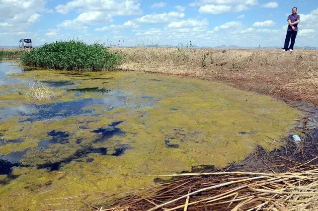 圖為《第一財經(jīng)日報》記者曾經(jīng)拍攝到的內(nèi)蒙古烏梁素海污染景象:水面大量黃苔滋生,意味著水體已受到嚴(yán)重污染。攝影/章軻