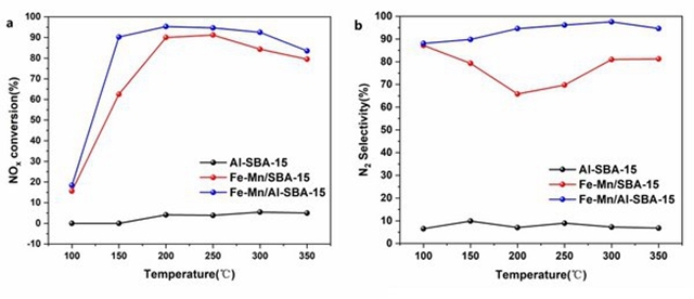 圖3. Fe-Mn/SBA-15催化劑和Fe-Mn/Al-SBA-15催化劑的NH3-SCR脫硝活性結(jié)果. a NOx轉(zhuǎn)化率.b N2選擇性