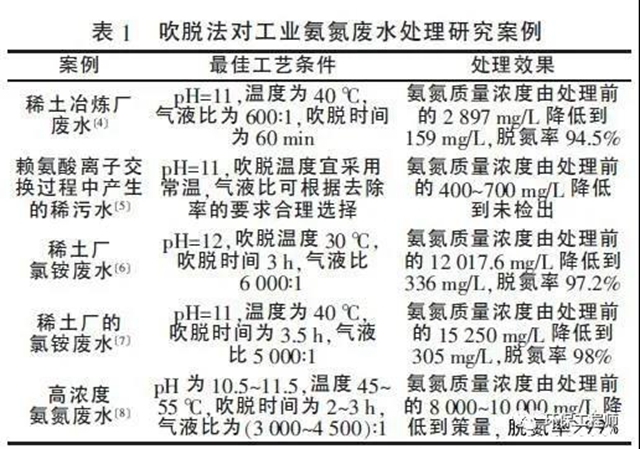 通過對比分析表1 可以得出:(1)吹脫法普遍適宜的pH 在11 附近;(2)考慮經(jīng)濟因素,溫度在30~40 ℃附近較為可行,且處理率高;(3)吹脫時間為3 h左右;(4)氣液比在5 000∶1 左右效果較好,且吹脫溫度越高,氣液比越??;(5)吹脫后廢水的濃度可降低到中低濃度;(6)脫氮率基本保持90%以上。盡管吹脫法可以將大部分氨氮脫除, 但處理后的廢水中氨氮仍然高達100 mg/L 以上,無法直接排放,還需要后續(xù)深度處理
