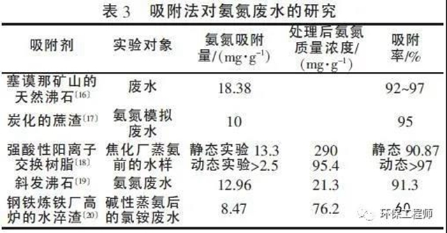 由表3 可以看出,對于傳統(tǒng)的吸附劑如沸石、交換樹脂等, 其對氨氮的處理率較高, 一般能達到90%以上。