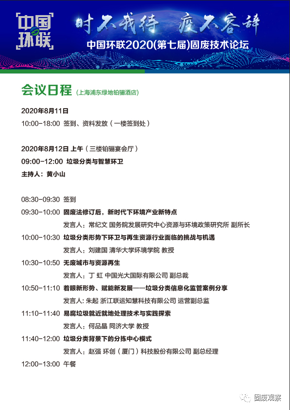 中國環(huán)聯(lián)2020(第七屆)固廢技術(shù)論壇定于2020年8月12-13日在上海市與第二十一屆中國環(huán)博會(2020年8月13-15日)背靠背召開。論壇將聚焦“疫情影響下垃圾焚燒處理潛在市場”、“垃圾分類新政策下行業(yè)特點”、“餐廚垃圾處理市場與短板”、“建筑垃圾資源化”、“固廢法修訂帶來行業(yè)新機(jī)遇”等熱點話題。我們邀請到常紀(jì)文、徐海云、劉建國、何品晶、張益、黃小山、徐進(jìn)軍等資深專家,以及在垃圾分類、環(huán)衛(wèi)管理、固廢處理、無廢城市等領(lǐng)域的卓越企業(yè)老總等,一起解讀最新政策與行業(yè)機(jī)遇、分析市場趨勢與技術(shù)焦點、分享創(chuàng)新模式與經(jīng)營理念,共同為“后疫情時代”的環(huán)境衛(wèi)生與生態(tài)環(huán)境建設(shè)獻(xiàn)計獻(xiàn)策。