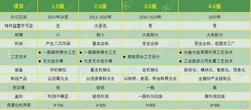而4.0版是指在現(xiàn)代化工廠資源化處理的基礎(chǔ)上,再附加互聯(lián)網(wǎng)、衛(wèi)星定位等現(xiàn)代高端技術(shù),將建筑垃圾資源化過程中的每一個環(huán)節(jié)精細化控制和處理,生產(chǎn)出利潤空間大、高附加值產(chǎn)品,盈利模式可以不再依靠政府補貼而進行市場化運營的發(fā)展模式。