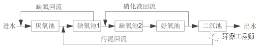 該工藝的主要目的是優(yōu)化除磷效果,第二個(gè)缺氧池進(jìn)水中含有一定量的碳源,該部分碳源反硝化速率較高,在該部分碳源消耗殆盡后,還可進(jìn)行內(nèi)源呼吸反硝化,雖然反硝化速率較低,但可進(jìn)一步提高TN的去除率。