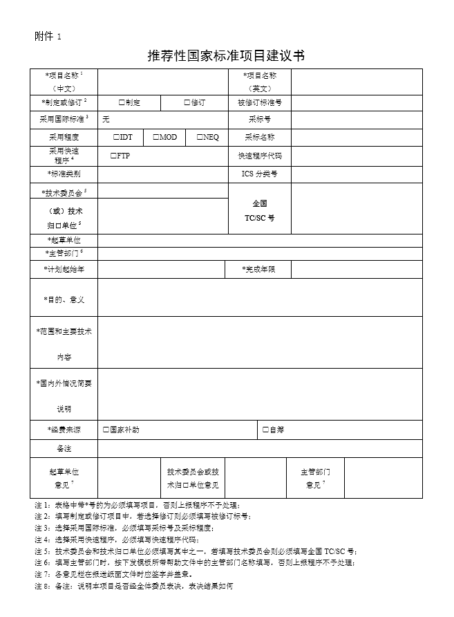 a. 《推薦性國家標準項目建議書》(一式三份,原件簽字、蓋單位公章,附電子版),見附件1。