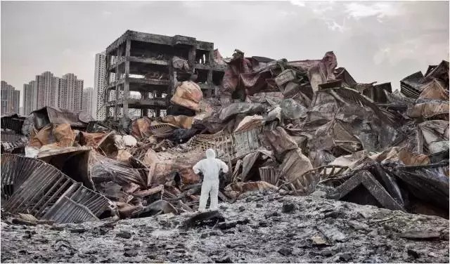 為照顧當(dāng)?shù)氐膭?dòng)物依然住在福島的中村先生這個(gè)是在福島目前生活的唯一的日本人——中村先生,他是全世界輻射量最高的人之一??赡鼙炔涣饲袪栔Z貝利,但他是日本最高的。我為了取得他的信任,跟他住了兩天,通過手機(jī)免提翻譯來采訪他。他非常信任我,他告訴我說你在我這沒有問題,但如果你被核輻射以后的所有后果我不承擔(dān)責(zé)任。這個(gè)老人現(xiàn)在一直在日本這個(gè)地方照顧動(dòng)物,我看到他跟動(dòng)物在一起的時(shí)候,我覺得他跟動(dòng)物那種情感、那種自然是無與倫比的。2015.8·12 天津?yàn)I海新區(qū)爆炸事故該照片獲得“荷賽”一般新聞?lì)悊畏髌啡泉?jiǎng)當(dāng)然作為記者,我們有很多不能言說的東西,有很多報(bào)道的禁區(qū),我們是怎么去應(yīng)對(duì)的呢?天津大爆炸這張照片大家可能知道,(獲得了)今年的荷賽獎(jiǎng),包括一些國內(nèi)的大獎(jiǎng)。這是我第三天去拍的一張照片。