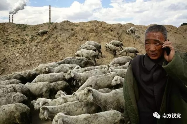 △一名男子趕著羊群,遠(yuǎn)處的大煙囪正冒著濃煙。