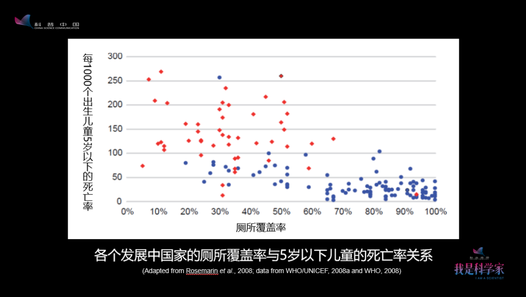 圖中最左邊的1000個(gè)兒童,5歲以下的死亡人數(shù)高達(dá)近300個(gè),但如果是到了100%有衛(wèi)生廁所的這邊,死亡人數(shù)幾乎就是0了。這是用大數(shù)據(jù)證明了廁所和人類健康的關(guān)系——衛(wèi)生廁所的數(shù)量越多,兒童的死亡率越低。