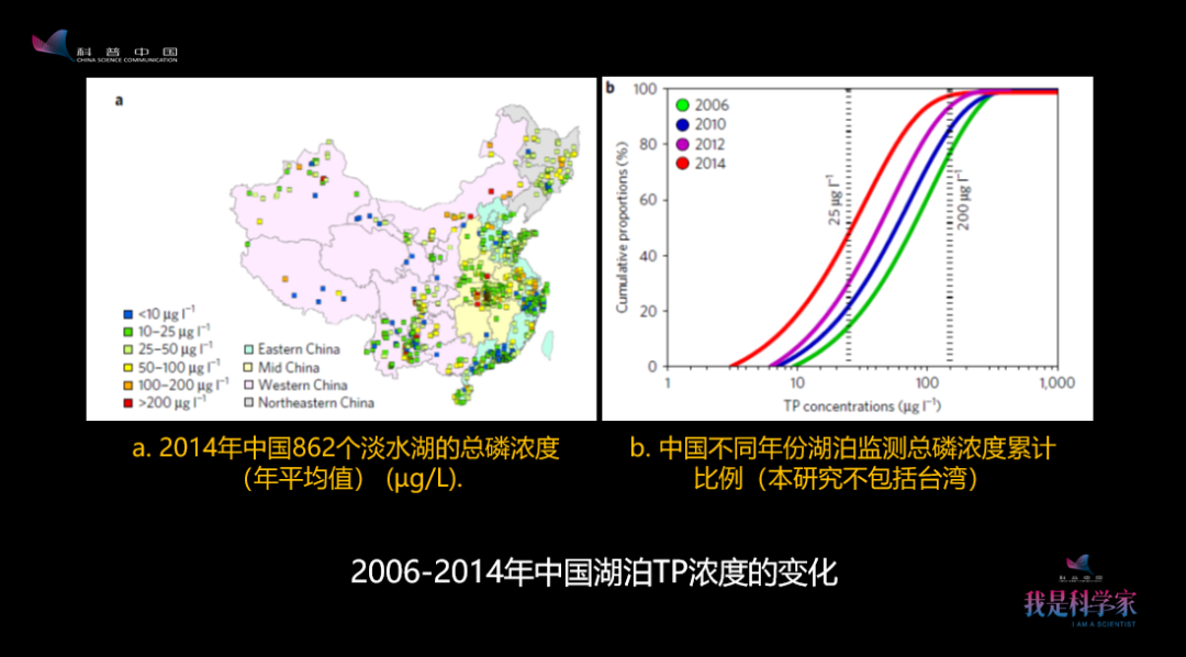 這個(gè)中國(guó)地圖表明我們有很多的污染物沒(méi)有處理好,就會(huì)進(jìn)入到湖泊里面。這個(gè)地方講的是磷會(huì)到我們的湖泊里。如果沒(méi)有處理好,氮也會(huì)到湖泊里去,也會(huì)到各種水體里去。