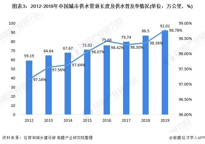 我國供水市場進入平穩(wěn)發(fā)展狀態(tài)得益于近年來我國供水管道長度及供水普及率的逐年增長。2019年我國城市供水管道長度達92.01萬公里,供水普及率達98.78%。