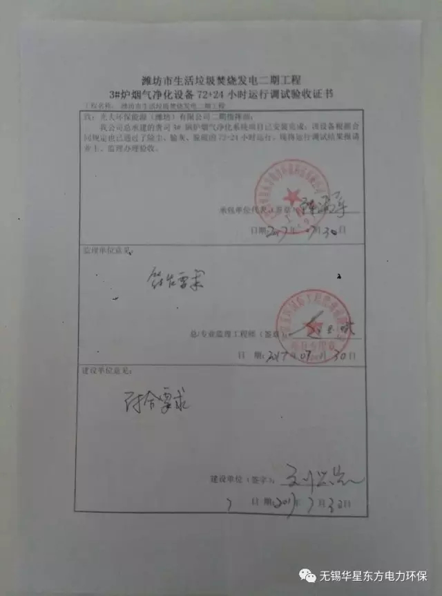 ?無錫華星東方環(huán)??偘?xiàng)目山東濰坊3x500t/d生活垃圾焚燒廠二期工程通過72+24小時試運(yùn)行