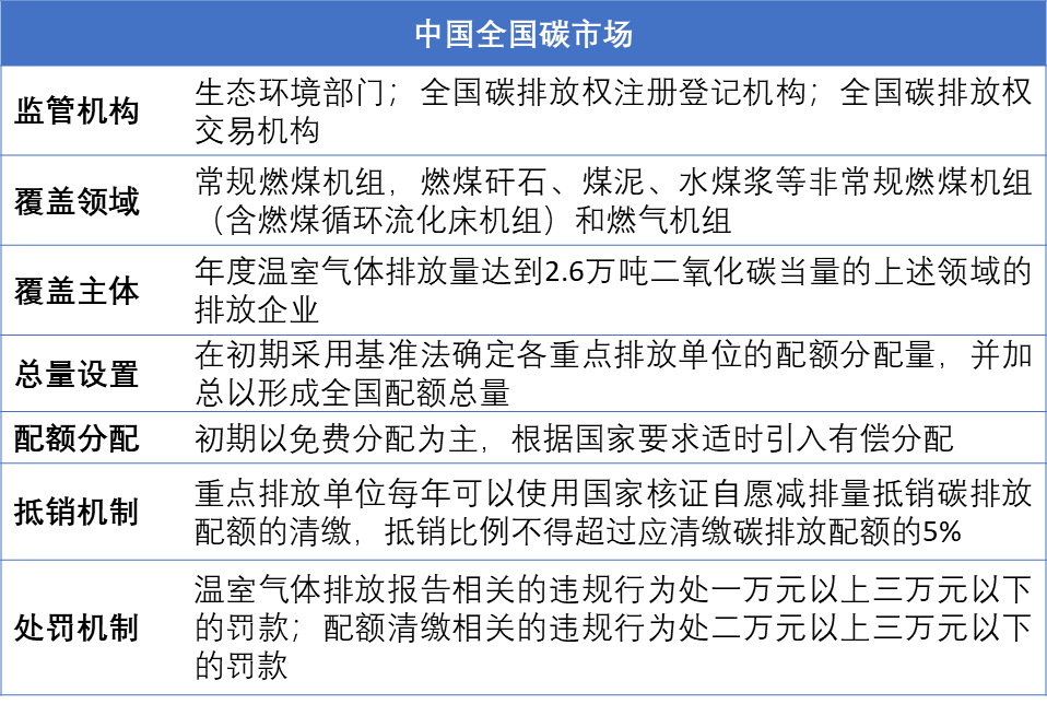 目前,中國的全國碳市場已經進入交易前的最后準備階段。參考生態(tài)環(huán)境部發(fā)布的《2019-2020年全國碳排放權交易配額總量設定與分配實施方案(發(fā)電行業(yè))》、《碳排放權交易管理辦法(試行)》以及《碳排放權交易管理暫行條例(草案修改稿)》等文件,即將啟動的全國碳市場將以生態(tài)環(huán)境部門為主要監(jiān)管機構、覆蓋范圍為化石能源發(fā)電及發(fā)熱行業(yè)的二氧化碳排放,在初期通過基準法確定各重點排放單位的配額分配量,并加總以形成全國配額總量。此外,初期的配額分配將以免費分配為主,同時允許以國家核證自愿減排量抵銷碳排放配額,抵消比例不得超過應清繳碳排放配額的5%。相關的機制設計見下表: