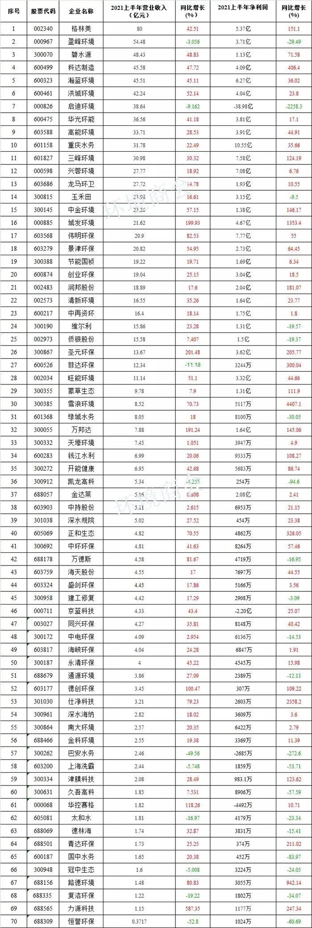 據(jù)全國工商聯(lián)環(huán)境商會(huì)不完全統(tǒng)計(jì),目前A股已有約70家環(huán)境企業(yè)披露半年報(bào),營收實(shí)現(xiàn)同比增長的企業(yè)占比為85.7%,凈利實(shí)現(xiàn)同比增長的企業(yè)占比71.4%,49家企業(yè)營收凈利雙增。