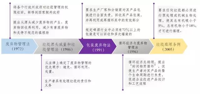 1991年頒布的《包裝廢棄物法》將包裝廢棄物的收集和處理責(zé)任從過(guò)去的各個(gè)行政州政府分?jǐn)偨o了各生產(chǎn)廠家、分銷(xiāo)商等企業(yè)機(jī)構(gòu),要求生產(chǎn)廠家和分銷(xiāo)商回收其產(chǎn)品包裝,并進(jìn)行再利用,該法催生了德國(guó)著名的“二元回收系統(tǒng)”(即“綠點(diǎn)公司”),與公共環(huán)衛(wèi)回收系統(tǒng)平行運(yùn)作。