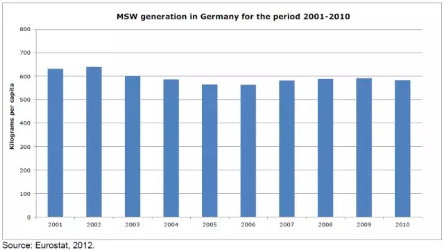 根據(jù)歐洲統(tǒng)計(jì)局的數(shù)據(jù),從2001年至2010年,德國(guó)的城市生活垃圾總產(chǎn)生量在5000萬(wàn)噸左右浮動(dòng),但是人均垃圾產(chǎn)生量有所下降,從2001年的632kg/a(1.73kg/d)減少到2006年的564kg/a(1.55kg/d)。