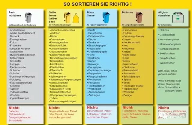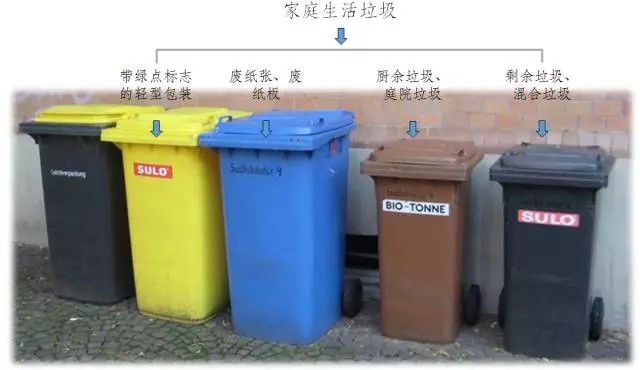 德國(guó)生活垃圾分類(lèi)多采用“五分法”,即將生活垃圾分為以下五大類(lèi)分別扔入不同顏色垃圾桶:棕色桶裝有機(jī)垃圾(包括剩飯剩菜、果皮骨頭等廚余垃圾,庭院綠化垃圾);黃色桶(或袋)裝輕型包裝(如塑料袋,包裝盒,牛奶盒等);藍(lán)色桶收集廢紙與廢紙箱;廢玻璃經(jīng)過(guò)分類(lèi)后分別投入棕色、白色、綠色三種顏色的垃圾桶;剩余黑色或灰色的桶,用來(lái)收集所有居民分到無(wú)法再分的剩余垃圾。