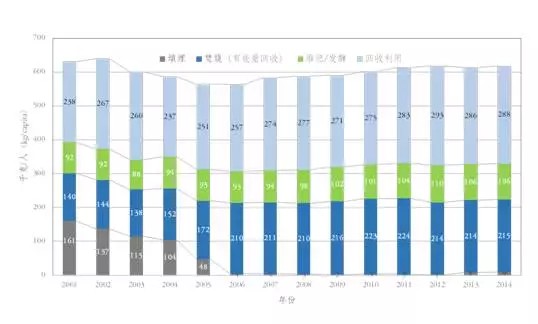 德國(guó)的生活垃圾處理方式總體可以歸為四類(lèi):填埋、有能量回收的焚燒、堆肥/發(fā)酵和回收利用,上圖反映了2001-2014年德國(guó)城市生活垃圾按不同方式的處理量。進(jìn)入21世紀(jì)以來(lái),德國(guó)城市生活垃圾的直接回收利用率和有機(jī)處理(堆肥發(fā)酵)率都有穩(wěn)步提升,直接回收利用率的增長(zhǎng)更為顯著,從2001年的37.7%增長(zhǎng)至2014年的46.6%。從2001年至2005年,德國(guó)的生活垃圾填埋量逐年下降,尤為值得注意的是,到2006年,生活垃圾填埋處理的占比已經(jīng)不足1%,這標(biāo)志著德國(guó)城市生活垃圾正式開(kāi)始進(jìn)入“零填埋”時(shí)代。這一轉(zhuǎn)變與德國(guó)2005年頒布的《垃圾填埋條例》是密切相關(guān)的,根據(jù)條例,垃圾填埋基本只接收經(jīng)過(guò)垃圾生物處理或焚燒處理后的灰渣,因此大幅降低了生活垃圾的填埋量。