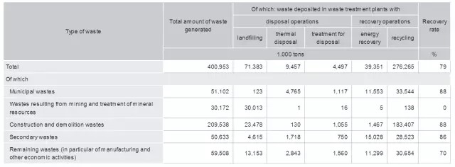 按照產(chǎn)生來(lái)源,德國(guó)的城市生活垃圾(MSW)主要分為家庭垃圾和其他垃圾兩大類(lèi)。家庭垃圾包括普通家庭生活垃圾、公共垃圾、大件垃圾(廢舊家具、家電等)、有機(jī)垃圾、可回收利用的垃圾(玻璃、廢紙、紙板、塑料、輕質(zhì)包裝材料、金屬等);其他垃圾包括街道清掃垃圾、菜場(chǎng)垃圾、其他混合生活垃圾等。