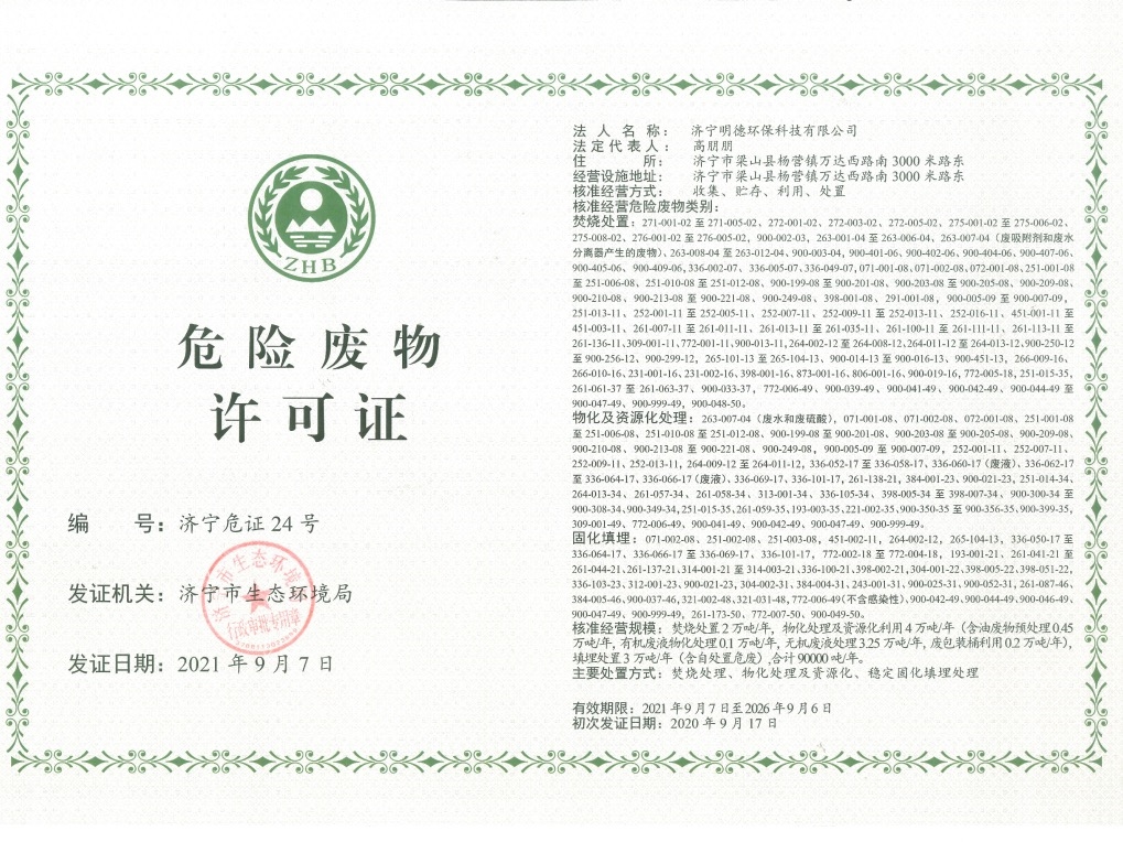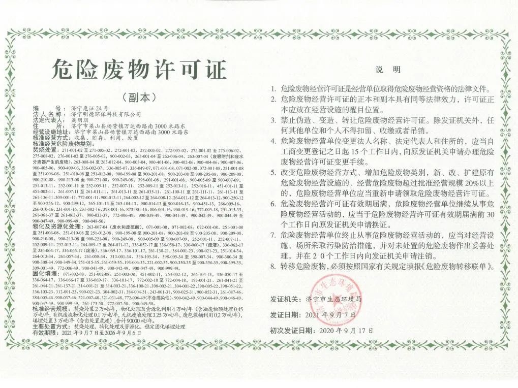 9月10日,雅居樂環(huán)保集團旗下濟寧明德環(huán)??萍加邢薰?以下簡稱“濟寧明德項目”)喜獲濟寧市生態(tài)環(huán)境局頒發(fā)的5年期《危險廢物許可證》。這也是當(dāng)?shù)貎H有的兩張5年期《危險廢物許可證》之一。