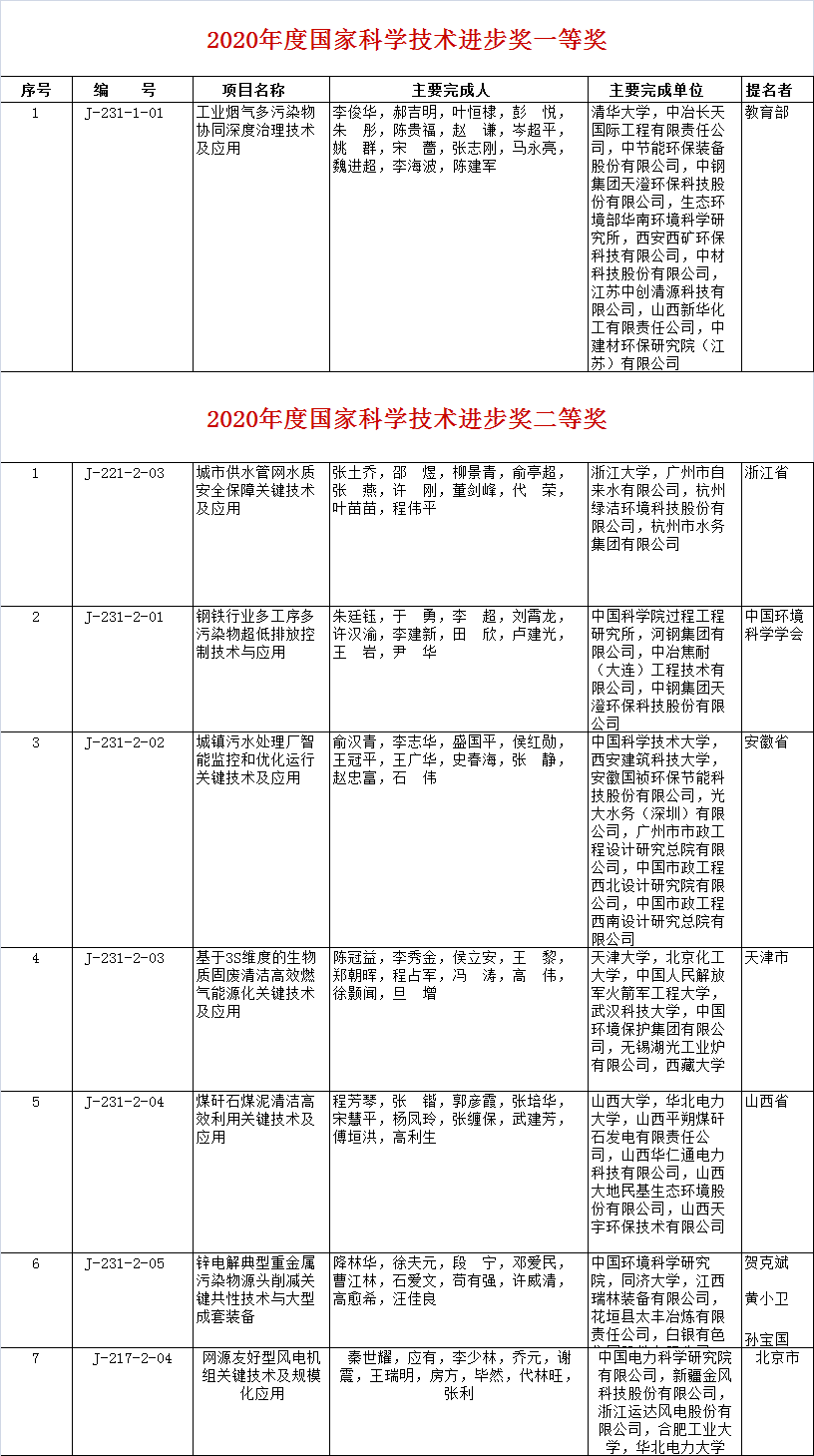 環(huán)境商會匯總整理了生態(tài)環(huán)境領(lǐng)域獲獎名單,共有11個項目榮獲2020年國家科技獎,其中,王愛杰、彭永臻、中國科學(xué)院生態(tài)環(huán)境研究中心程浩毅、梁斌、中持股份邵凱、信開水環(huán)境侯鋒等共同完成的“污水深度生物脫氮技術(shù)及應(yīng)用”項目榮獲國家技術(shù)發(fā)明獎二等獎,李俊華,郝吉明、中節(jié)能環(huán)保裝備等聯(lián)合完成的“工業(yè)煙氣多污染物協(xié)同深度治理技術(shù)及應(yīng)用”項目榮獲國家科技進步獎一等獎;俞漢青、中節(jié)能國禎、光大水務(wù)等聯(lián)合完成的“城鎮(zhèn)污水處理廠智能監(jiān)控和優(yōu)化運行關(guān)鍵技術(shù)及應(yīng)用”;新疆金風(fēng)科技等申報的“網(wǎng)源友好型風(fēng)電機組關(guān)鍵技術(shù)及規(guī)?;瘧?yīng)用”等項目榮獲國家科技進步二等獎。