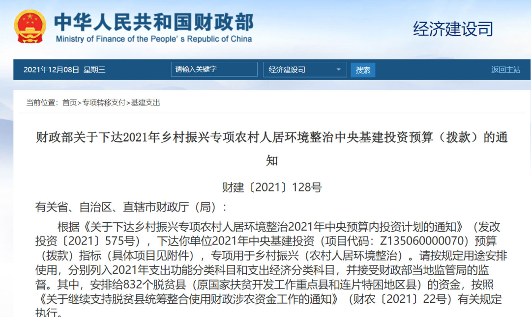 也就是說(shuō),農(nóng)村人居環(huán)境整治提升,主要的資金來(lái)源還是要靠地方。中央這邊,會(huì)安排一定的中央預(yù)算內(nèi)投資,給予獎(jiǎng)補(bǔ)。查了一下,今年5月12日,財(cái)政部就曾經(jīng)下達(dá)“2021年鄉(xiāng)村振興專項(xiàng)農(nóng)村人居環(huán)境整治中央基建投資預(yù)算(撥款)”,總額為29.6億元.去年8月,財(cái)政部也曾經(jīng)下達(dá)2020年的“農(nóng)村人居環(huán)境整治專項(xiàng)中央基建投資預(yù)算(撥款)”,當(dāng)時(shí)的總額是29.756億元。從這兩年的情況看,每年全國(guó)大概30億吧,這是中央拿出來(lái)的錢。地方各級(jí)政府要保障農(nóng)村人居環(huán)境整治基礎(chǔ)設(shè)施建設(shè)和運(yùn)行資金,統(tǒng)籌安排土地出讓收入用于改善農(nóng)村人居環(huán)境,鼓勵(lì)各地通過(guò)發(fā)行地方政府債券等方式用于符合條件的農(nóng)村人居環(huán)境建設(shè)項(xiàng)目。看得出來(lái),地方政府的投入,主要來(lái)源是兩個(gè):一是土地出讓金,二是發(fā)行地方債。