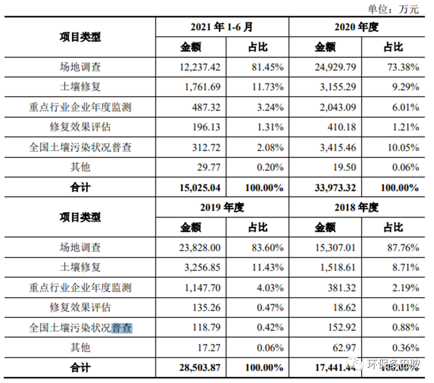 “報告期各期(2018-2021H1),公司土壤和地下水檢測業(yè)務收入分別為 17,441.44 萬元、28,503.87 萬元、33,973.32 萬元、15,025.04 萬元,占公司主營業(yè)務收入的比重分 別為 98.15%、95.69%、94.73%、91.81%?!?/span>