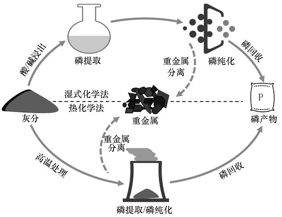 濕式化學法磷提取是通過直接投加酸或堿溶液,改變灰分酸堿環(huán)境,以增大磷的溶解度,使磷由固相轉(zhuǎn)移至液相。之后,將溶解磷與重金屬分離后得到具有附加值的磷產(chǎn)品。