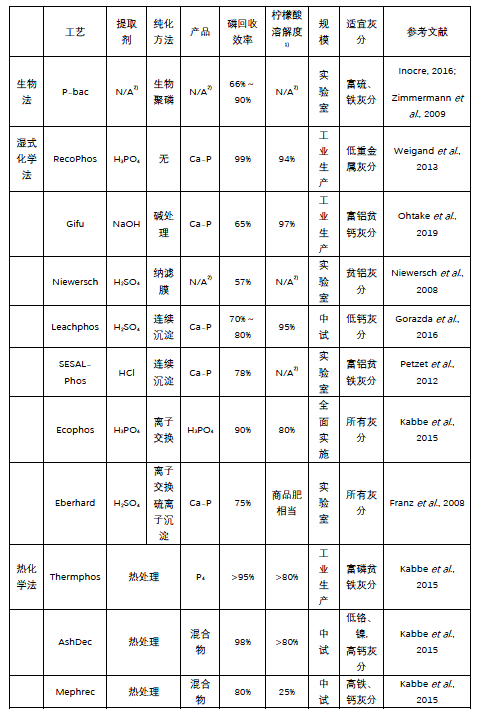 熱化學法是在900~2000 ℃高溫下,將重金屬及其化合物氣化(或液化),通過氣相分離(或密度分離)裝置實現(xiàn)重金屬與磷的分離。因此,熱化學法借助于高溫環(huán)境,可同時實現(xiàn)磷提取與磷純化。另外,高溫環(huán)境通過打破灰分中原有礦物相,形成新的磷酸鹽礦物相(Ca-P) 繼而提高了磷酸鹽的可植物利用度。目前,具有代表性的熱化學法有Thermphos、AshDec和Mephrec工藝。各個方法的比較如下表所示。