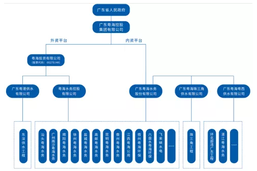 1987年,粵海集團收購香港上市公司友聯世界的控制權,并于1988年將其改名為粵海投資,粵海投資也因此成為全國駐港首家在港上市企業(yè)。其在環(huán)境領域主要聚焦供水領域,涉及原水供應、自來水經營、污水處理和水環(huán)境治理全產業(yè)鏈,提供從投資到運營管理的綜合一體化服務。外資平臺以香港上市公司粵海投資為主體,內資平臺以廣東粵海水務股份有限公司為主體。具體如下: