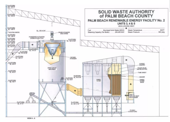 接下來說重點,介紹一下這個焚燒廠。全廠為3x1000t/d的偉倫爐排,煙氣工藝采用了SDA+布袋+GGH+SGH+SCR。該廠位于特朗普老家,而且離得不遠,是目前美國最先進的焚燒廠,也是第一座采用SCR工藝的焚燒廠,2012年開始建設(shè)至2015年投入商業(yè)運行,隸屬于佛羅里達州海岸縣固廢管理局。