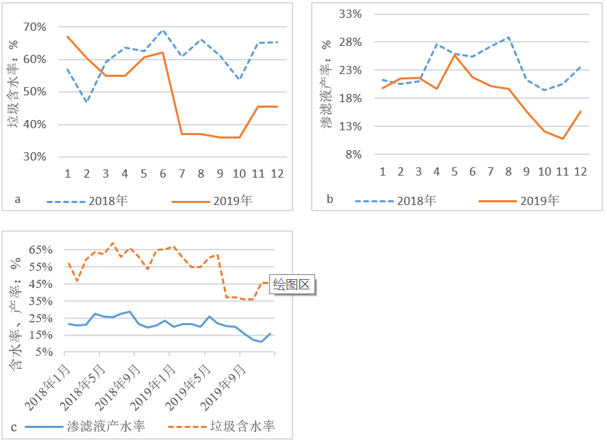 圖9  2018年-2019年生活垃圾分類前后垃圾含水率、滲濾液產(chǎn)率及兩者變化趨勢(shì)