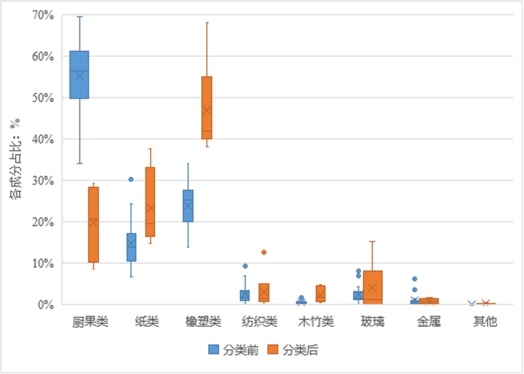 圖1  生活垃圾分類前、后各成分占比分布對(duì)比圖