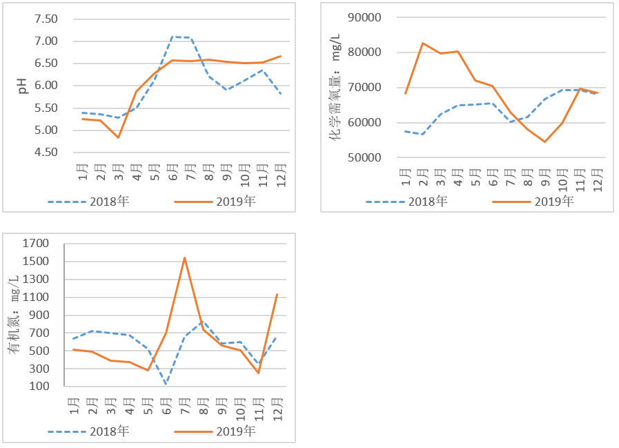 圖12  2018年與2019年生活垃圾分類前后滲濾液水質(zhì)中pH、化學(xué)需氧量、總氮變化趨勢(shì)