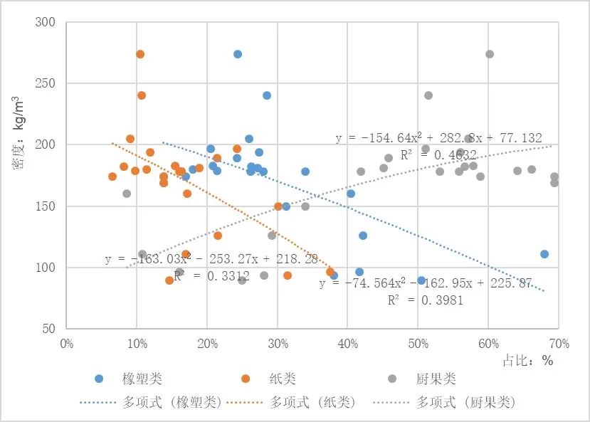 圖13  生活垃圾主要成分占比對(duì)垃圾密度的影響趨勢(shì)圖