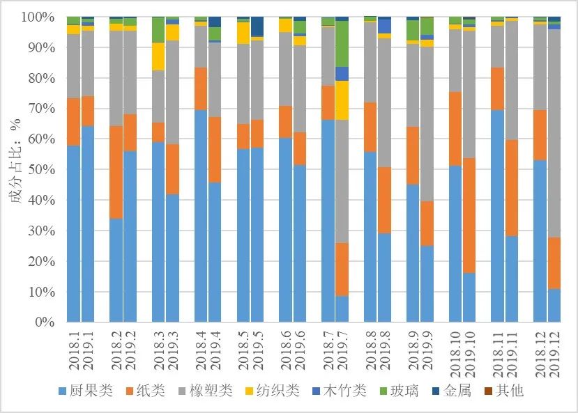 圖6  2018年至2019年生活垃圾分類前后各成分占比月度堆積圖
