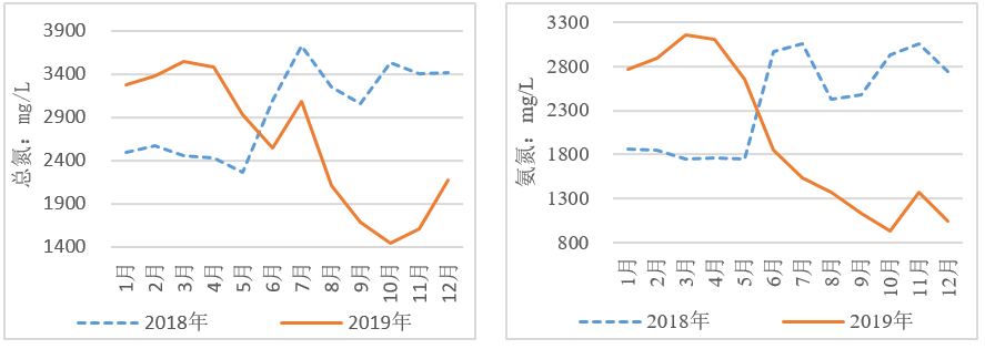 圖11  2018、2019年生活垃圾分類前后滲瀝液水質(zhì)中氨氮、有機(jī)氮變化趨勢(shì)