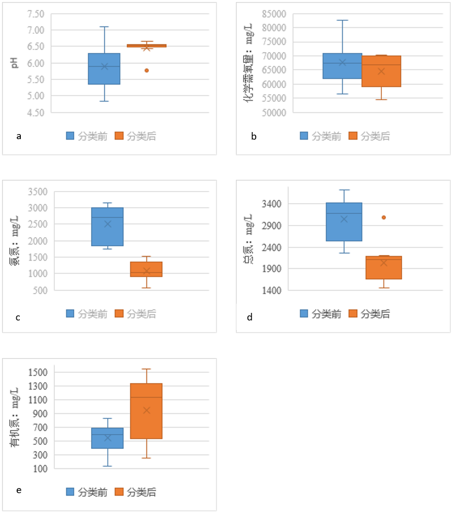 圖5  生活垃圾分類前后滲濾液主要水質(zhì)指標(biāo)分布對(duì)比