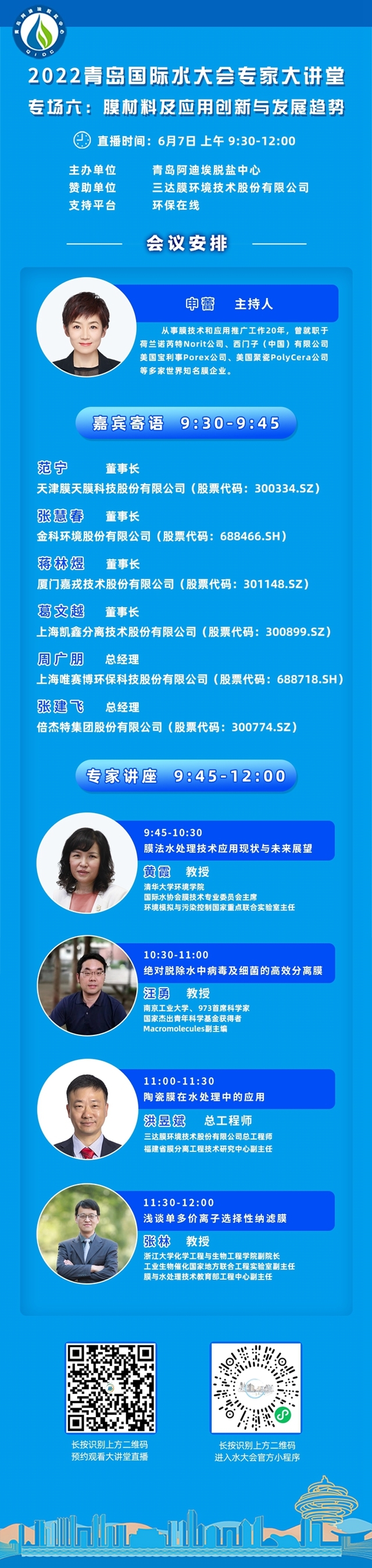 2022青島國際水大會(huì)專家大講堂又要來啦~與專家共同探討過海水淡化、水資源化、水生態(tài)修復(fù)等多個(gè)主題,6月7日,讓我們?cè)龠M(jìn)入專場(chǎng)六:膜材料及應(yīng)用創(chuàng)新與發(fā)展趨勢(shì)論壇!