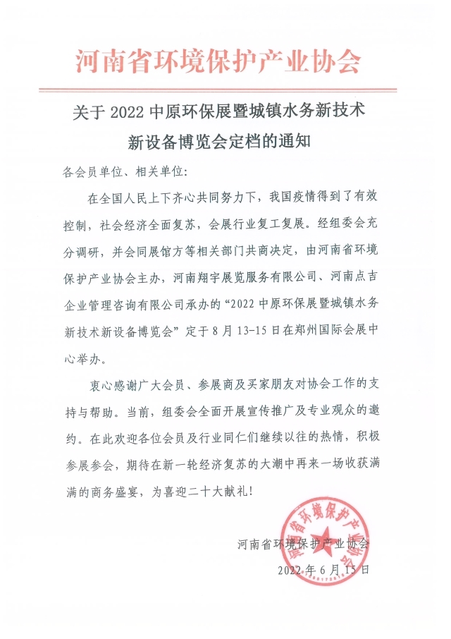 關(guān)于2022中原環(huán)保展暨城鎮(zhèn)水務(wù)新技術(shù)新設(shè)備博覽會(huì)定檔的通知