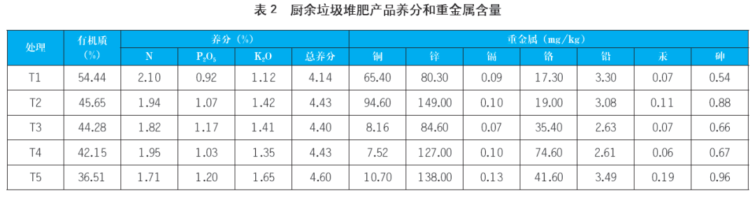 表2為各處理廚余垃圾堆肥產(chǎn)品的有機(jī)質(zhì)、養(yǎng)分和重金屬含量。在堆肥過程中,各處理有機(jī)質(zhì)含量不斷下降,但均滿足《有機(jī)肥料》(NY/T 525-2021)標(biāo)準(zhǔn)(有機(jī)質(zhì)含量≥30%)。由于有機(jī)物礦化會導(dǎo)致堆體體重減輕發(fā)生濃縮效應(yīng),總養(yǎng)分(以N+P2O5+K2O計(jì))含量增加,各處理含量均>4.0%,具有較高的營養(yǎng)價值。對于各處理重金屬含量,鋅的含量最高(80.30~149.00mg/kg),其次為銅和鉻(7.52~94.60mg/kg和17.30~74.60mg/kg),再者是鉛(2.61~3.49mg/kg),鎘、汞、砷的含量保持在較低范圍(0.070~0.125mg/kg、0.061~0.187mg/kg和0.538~0.964mg/kg),遠(yuǎn)低于《有機(jī)肥料》(NY/T 525-2021)中重金屬濃度標(biāo)準(zhǔn)。