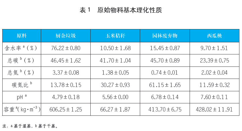 本試驗(yàn)以分類后廚余垃圾為原料,以粒徑控制在40~50mm以下的玉米秸稈(CS)、園林剪枝(GP)和西瓜秧(WS)按一定比例混合后,作為輔料加入到廚余垃圾中進(jìn)行堆肥。其中廚余垃圾主要含有60.79%菜葉、8.96%剩飯、19.31%果皮、3.68%蛋殼、1.97%骨頭以及5.29%其他物質(zhì)(以濕重計(jì)),主要分布在<30mm粒徑段,其次為>80mm和50~60mm的較大粒徑段,其他粒徑段含量較少。堆肥原料的理化性質(zhì)如表1所示。