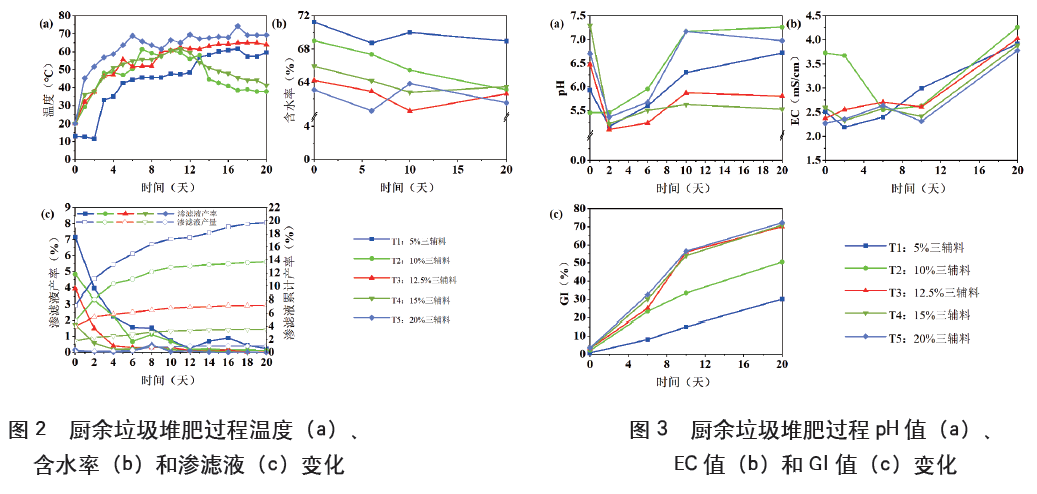 整體看來,各處理含水率呈不斷下降趨勢,而其他各處理含水率均低于5%三輔料處理(圖2b)。到堆肥結(jié)束時,添加12.5%和20%三輔料的處理含水率最低,分別為62.62%和61.54%;5%三輔料處理含水率為68.97%。堆肥開始時,隨著輔料配比的升高,滲濾液產(chǎn)率逐漸降低,5%三輔料和20%三輔料處理差異顯著,初始產(chǎn)率分別為7.2%和0.1%(圖2c)。當(dāng)輔料添加比例由5%增至12.5%時,滲濾液累計(jì)產(chǎn)率由19.7%降至7.2%;當(dāng)輔料添加比例增至20%時,滲濾液累計(jì)產(chǎn)率為1.0%。由此可見,當(dāng)輔料施用比例大于12.5%時,可以顯著減少由廚余垃圾的高含水率產(chǎn)生的大量滲濾液。