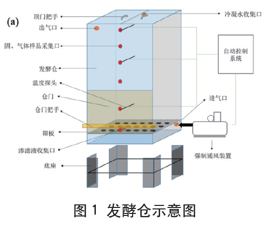 本研究采用模擬隧道發(fā)酵倉堆肥高度的中試密閉堆肥倉(1m×1m×3.5m)中進(jìn)行廚余垃圾堆肥試驗(yàn)。堆肥倉配備了上、中、下三個溫度探頭,自動控制系統(tǒng)連接溫度傳感器和通風(fēng)裝置,以實(shí)現(xiàn)溫度記錄和通風(fēng)控制,堆肥倉示意圖如圖1所示。本試驗(yàn)根據(jù)所添加的三輔料(其中CS:GP:WS=1:1:1)比例不同,共設(shè)置5個處理過程,分別添加5%(T1)、10%(T2)、12.5%(T3)、15%(T4)和20%(T5)三輔料。此外,為緩解餐廚垃圾酸化導(dǎo)致升溫緩慢的問題,堆肥中添加了1%(以干重計(jì))的生石灰。整個堆肥周期設(shè)為20天,其中第1~10天為高溫發(fā)酵階段,通風(fēng)速率為0.05~0.15m3/m3·min;第10~20天為后熟化階段,通風(fēng)速率為0.02m3/m3·min。在堆肥開始后第0、2、6、10、20天,在發(fā)酵倉的上、中、下三點(diǎn)每次分別采集約300g固體樣品用于后續(xù)指標(biāo)的測定。