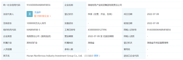 據(jù)企查查顯示信息,湖南有色產(chǎn)業(yè)投資集團有限責(zé)任公司注冊資金為100億元,經(jīng)營范圍包括經(jīng)營范圍包含:礦產(chǎn)資源(非煤礦山)開采;建設(shè)工程設(shè)計;礦產(chǎn)資源勘查;金屬與非金屬礦產(chǎn)資源地質(zhì)勘探;測繪服務(wù);職業(yè)衛(wèi)生技術(shù)服務(wù);放射衛(wèi)生技術(shù)服務(wù);安全評價業(yè)務(wù);安全生產(chǎn)檢驗檢測;危險廢物經(jīng)營;檢驗檢測服務(wù);地質(zhì)災(zāi)害危險性評估(依法須經(jīng)批準的項目,經(jīng)相關(guān)部門批準后方可開展經(jīng)營活動,具體經(jīng)營項目以相關(guān)部門批準文件或許可證件為準)一般項目:地質(zhì)勘查技術(shù)服務(wù);選礦;礦物洗選加工;再生資源加工;常用有色金屬冶煉;貴金屬冶煉;有色金屬鑄造;金屬礦石銷售;金屬材料銷售;新型金屬功能材料銷售;高性能有色金屬及合金材料銷售;新材料技術(shù)研發(fā);金屬廢料和碎屑加工處理;環(huán)保咨詢服務(wù);安全咨詢服務(wù);土壤污染治理與修復(fù)服務(wù);土壤環(huán)境污染防治服務(wù);水環(huán)境污染防治服務(wù);離岸貿(mào)易經(jīng)營;貿(mào)易經(jīng)紀;國內(nèi)貿(mào)易代理;進出口代理;工程和技術(shù)研究和試驗發(fā)展;環(huán)境保護監(jiān)測等。