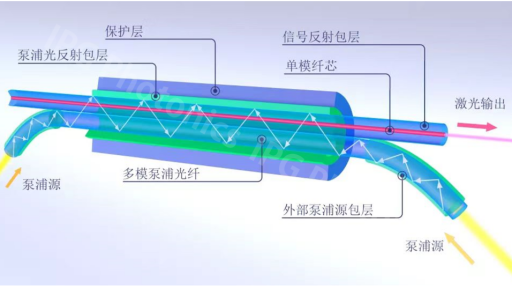 包層側(cè)泵浦技術(shù),由多模泵浦光纖和單模摻雜芯光纖組成雙光纖結(jié)構(gòu),將多模二極管光轉(zhuǎn)換成單模光纖激光器,具有極高的效率和高亮度。相比其他光纖激光器普遍使用端面泵浦而言,具有更高的效率和光束質(zhì)量(因?yàn)槎嗣姹猛ǔP枰褂梅瓷溏R,并且可能需要在激光器內(nèi)保持正氣壓,以避免灰塵和其他污染物)。