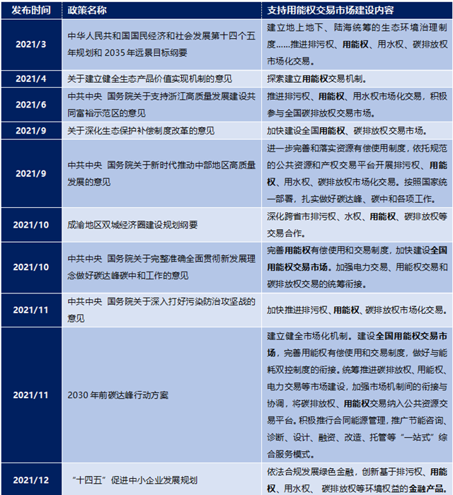 除《意見》外,2021年全年國家層面陸續(xù)發(fā)布多項政策,明確用能權交易機制建設在生態(tài)文明建設、碳達峰碳中和目標、生態(tài)環(huán)境治理、綠色金融、小微企業(yè)支持及推動我國中部地區(qū)和成渝雙城經(jīng)濟圈等局部地區(qū)高質量發(fā)展過程中的重要地位。