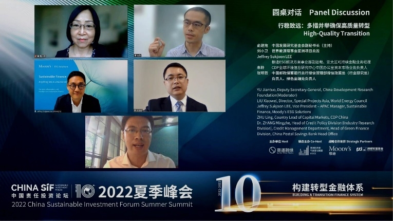 第二輪圓桌對(duì)話(huà)環(huán)節(jié)圍繞“多措并舉確保高質(zhì)量轉(zhuǎn)型”展開(kāi),由中國(guó)發(fā)展研究基金會(huì)副秘書(shū)長(zhǎng)俞建拖主持。世界能源理事會(huì)亞洲項(xiàng)目總監(jiān)劉小衛(wèi),穆迪ESG解決方案事業(yè)部副總裁、亞太區(qū)可持續(xù)金融業(yè)務(wù)經(jīng)理Jeffrey Sukjoon LEE,CDP全球環(huán)境信息研究中心中國(guó)辦公室資本市場(chǎng)業(yè)務(wù)負(fù)責(zé)人朱聆,中國(guó)郵政儲(chǔ)蓄銀行總行授信管理部授信政策處(行業(yè)研究處)負(fù)責(zé)人與綠色金融處負(fù)責(zé)人張明哲博士就高質(zhì)量轉(zhuǎn)型背景下,可持續(xù)金融存在的短板及其原因、以及潛在的解決方案展開(kāi)了熱烈討論。Jeffrey指出,轉(zhuǎn)型金融對(duì)推動(dòng)亞太地區(qū)的可持續(xù)發(fā)展至關(guān)重要。如果所在行業(yè)減排難度大的發(fā)行人希望進(jìn)入可持續(xù)金融市場(chǎng)獲得可持續(xù)融資,他們就需要可信的轉(zhuǎn)型計(jì)劃、戰(zhàn)略和指標(biāo)。雖然我們看到企業(yè)在溫室氣體排放的信息披露方面取得了進(jìn)步,但在標(biāo)準(zhǔn)化和覆蓋范圍方面仍有很多工作要做。