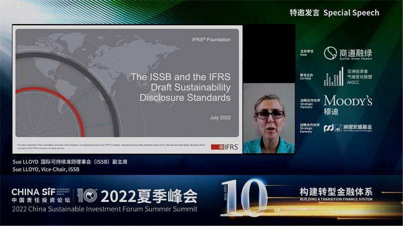 隨后,國(guó)際可持續(xù)準(zhǔn)則理事會(huì)(ISSB)副主席Sue LLOYD做了特邀發(fā)言。她介紹,ISSB由國(guó)際財(cái)務(wù)報(bào)告準(zhǔn)則(IFRS)基金會(huì)在2021年第26屆聯(lián)合國(guó)氣候變化大會(huì)上發(fā)起,旨在制定統(tǒng)一的可持續(xù)發(fā)展報(bào)告準(zhǔn)則。她分享了ISSB近期發(fā)布的兩份可持續(xù)披露準(zhǔn)則文件征求意見(jiàn)稿的主要內(nèi)容,即《國(guó)際財(cái)務(wù)報(bào)告可持續(xù)披露準(zhǔn)則第1號(hào)——可持續(xù)相關(guān)財(cái)務(wù)信息披露一般要求(征求意見(jiàn)稿)》和《國(guó)際財(cái)務(wù)報(bào)告可持續(xù)披露準(zhǔn)則第2號(hào)——氣候相關(guān)披露(征求意見(jiàn)稿)》,并呼吁大家在七月底之前積極提供反饋。